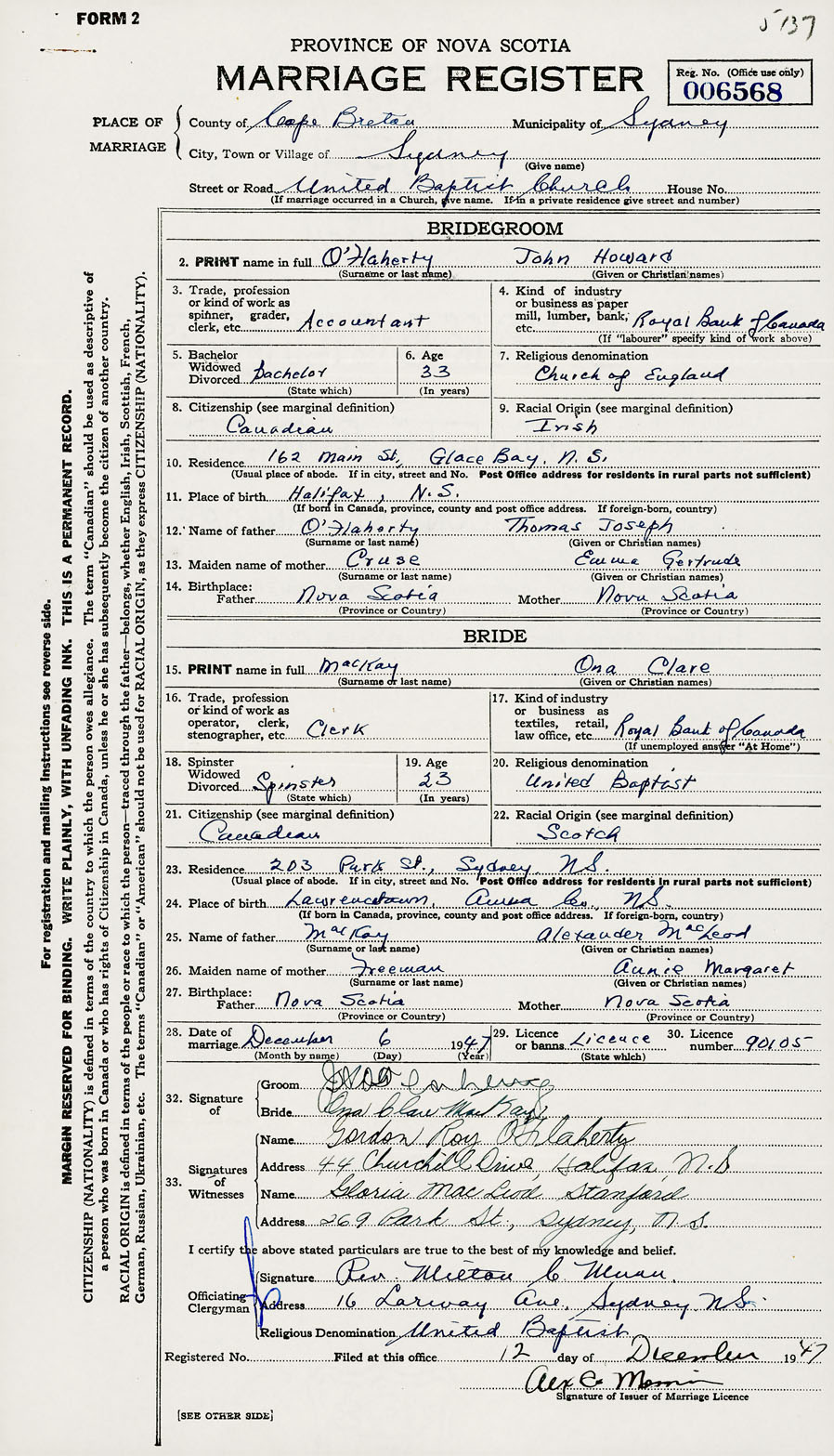 28. Date of marriage December 6 1947 29. By license or banns License 30. License number 90105