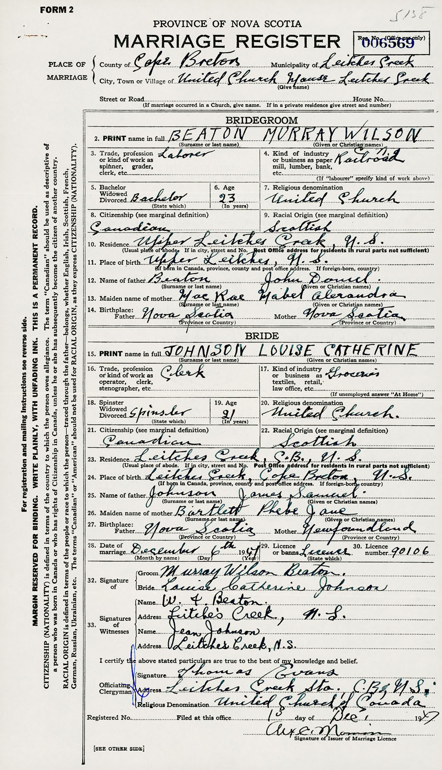 28. Date of marriage December 6 1947 29. By license or banns License 30. License number 90106
