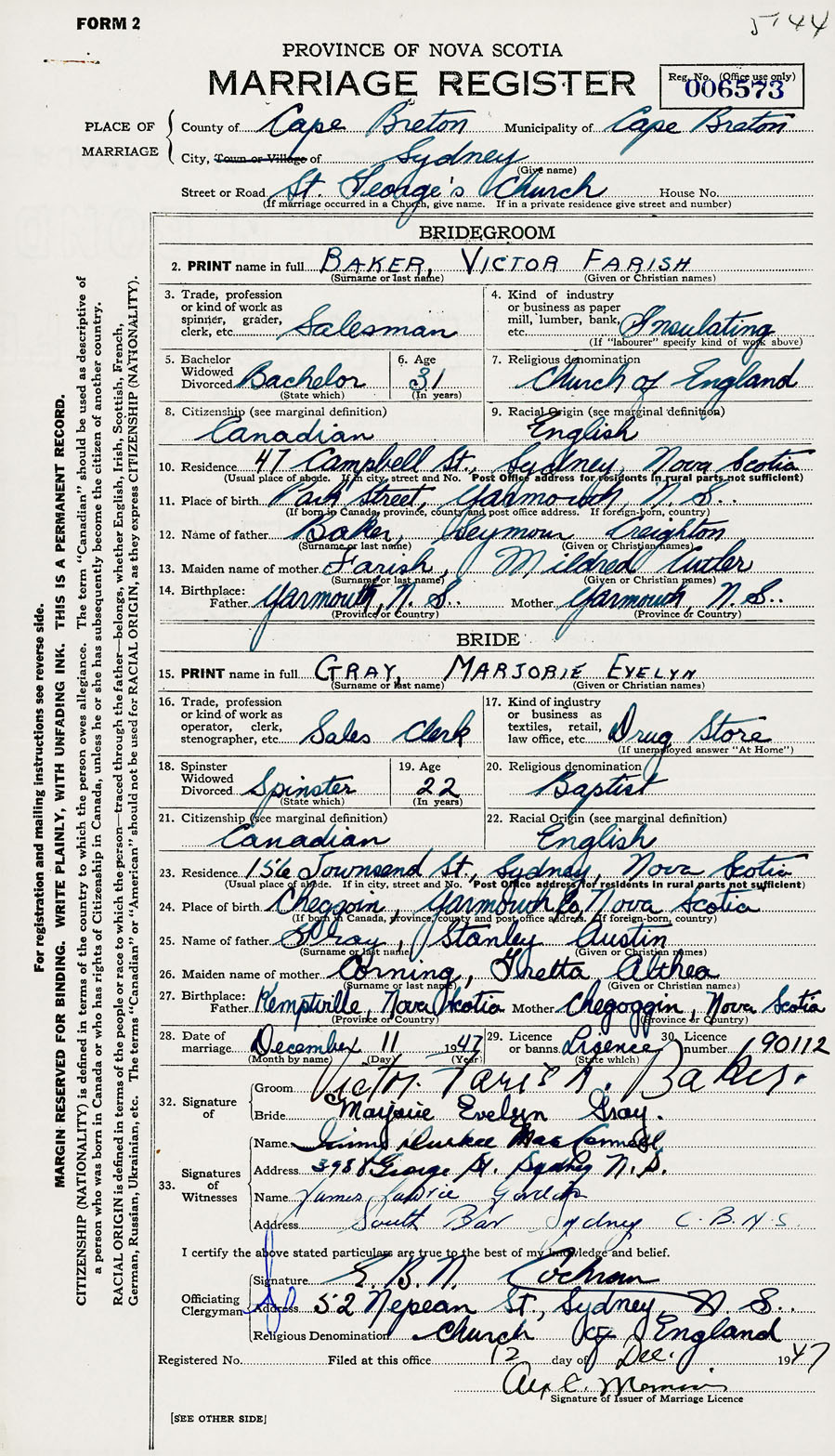28. Date of marriage December 11 1947 29. By license or banns License 30. License number 90112