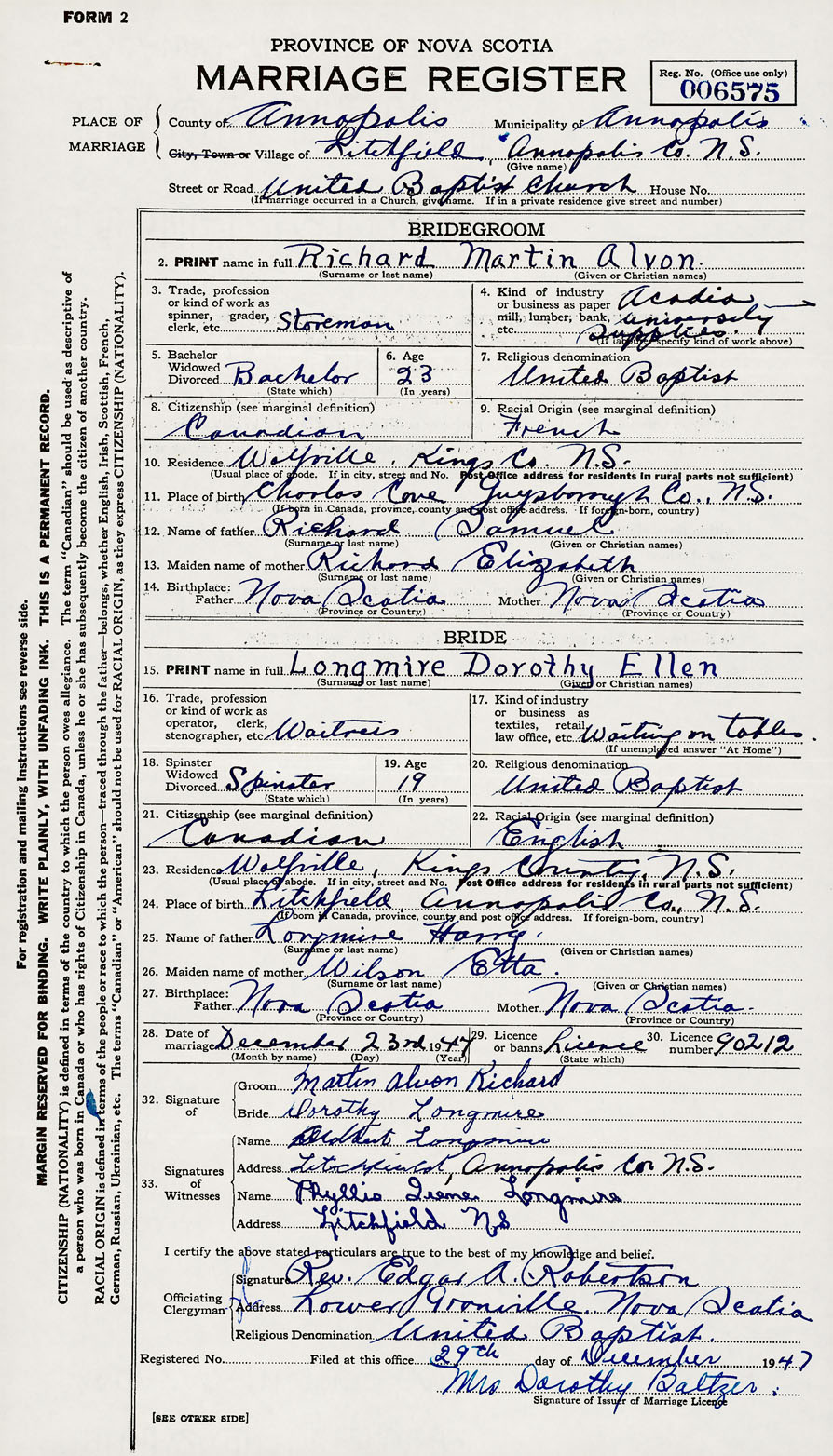 28. Date of marriage December 23 1947 29. By license or banns License 30. License number 90212