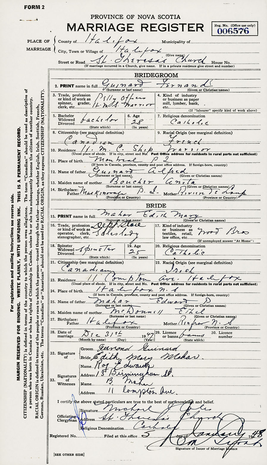 28. Date of marriage December 31 1947 29. By license or banns License 30. License number