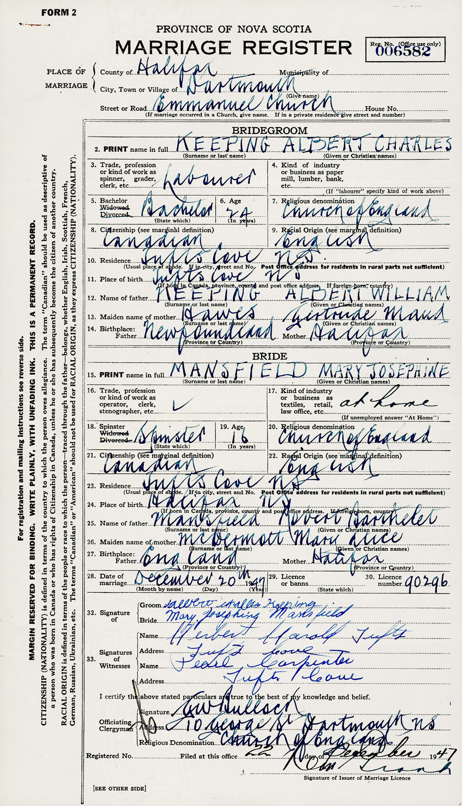 28. Date of marriage December 20 1947 29. By license or banns License 30. License number 90296