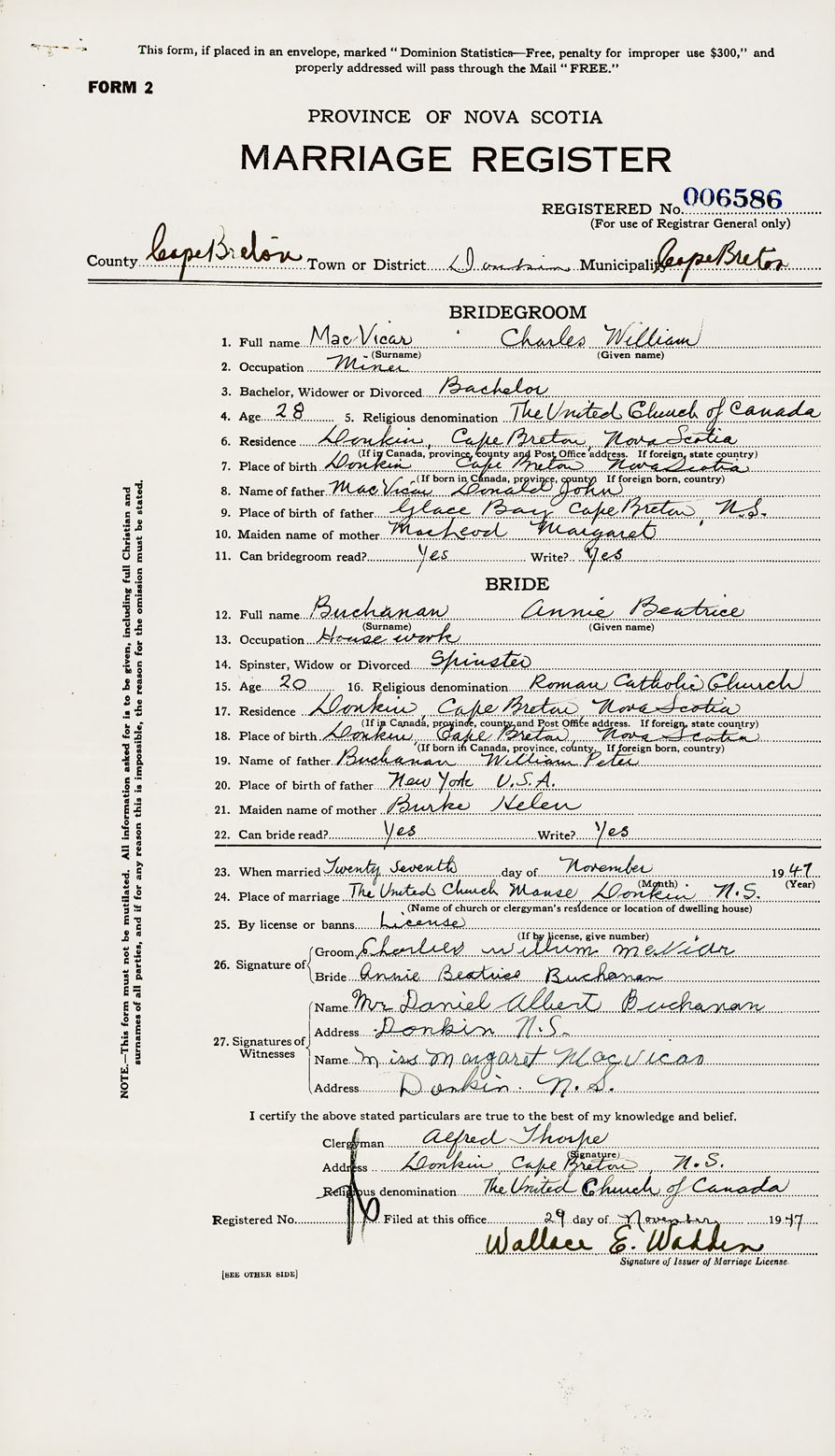 26. Place of marriage The United Church Manse, Donkin, Nova Scotia Donkin, Cape Breton County