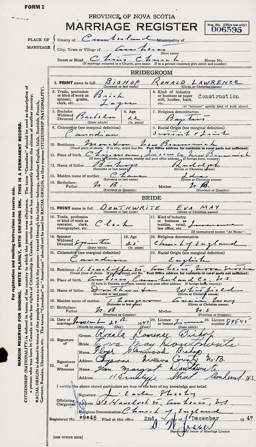 28. Date of marriage November 29 1947 29. By license or banns License 30. License number 89845