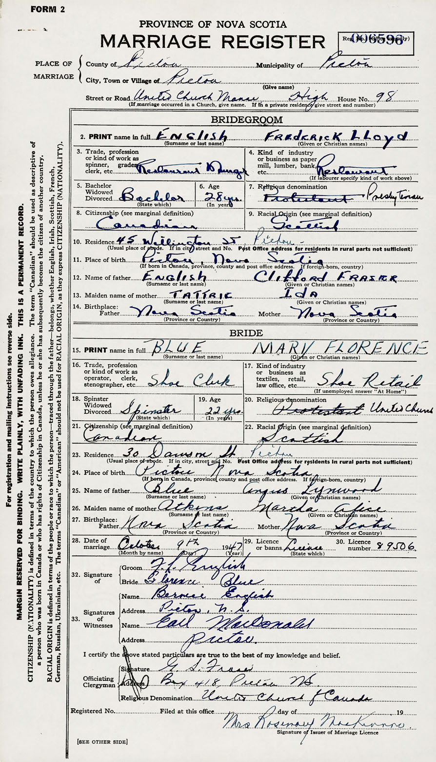 28. Date of marriage October 9 1947 29. By license or banns License 30. License number 89506