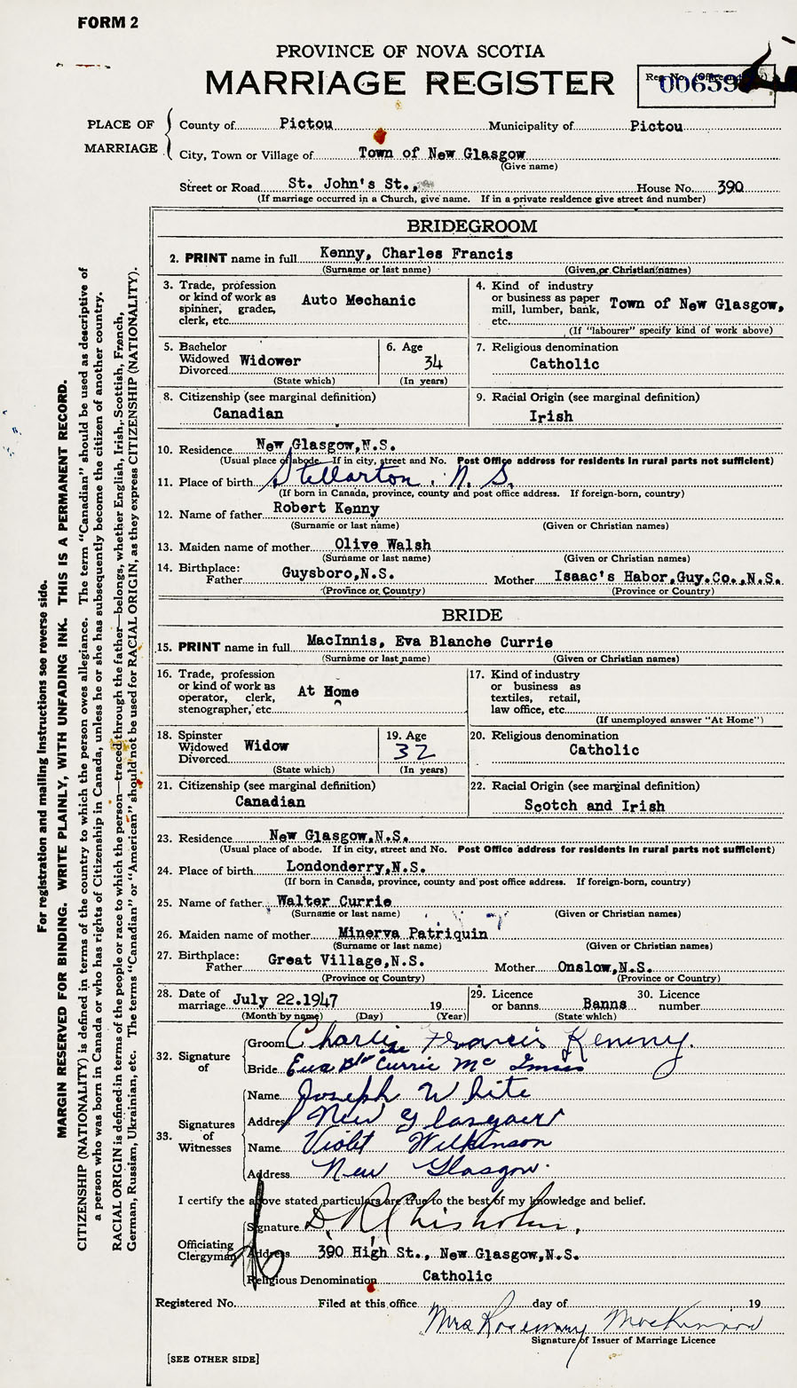 28. Date of marriage July 22 1947 29. By license or banns Banns 30. License number Banns