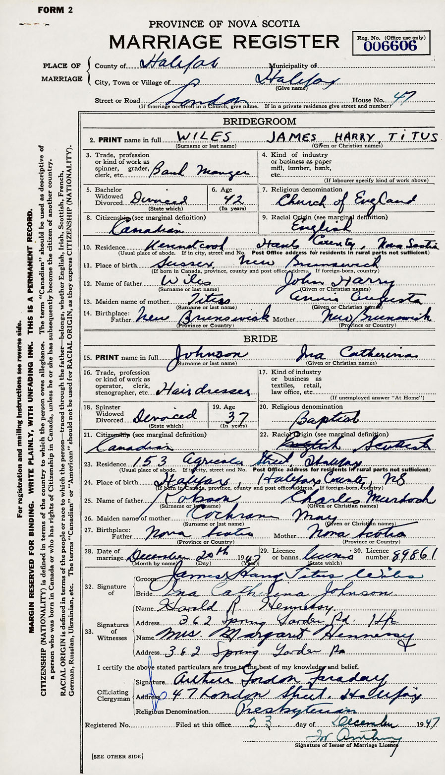 28. Date of marriage December 20 1947 29. By license or banns License 30. License number 89861