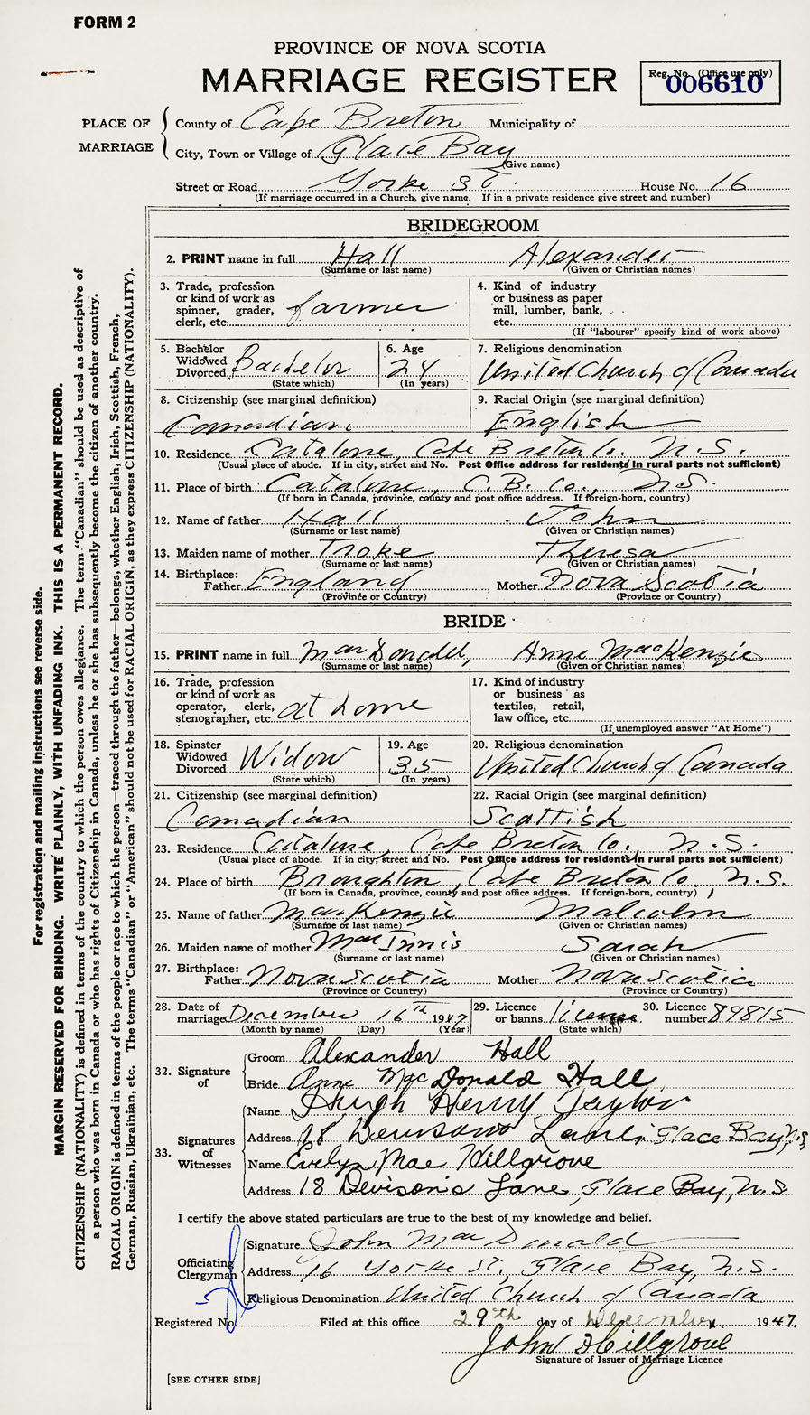 28. Date of marriage December 16 1947 29. By license or banns License 30. License number 89815