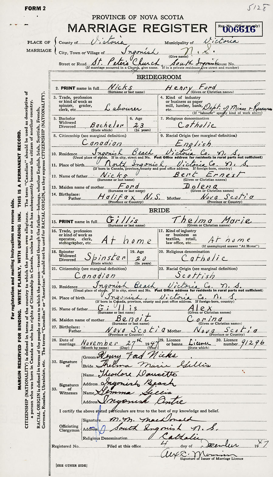 28. Date of marriage November 27 1947 29. By license or banns License 30. License number 91296