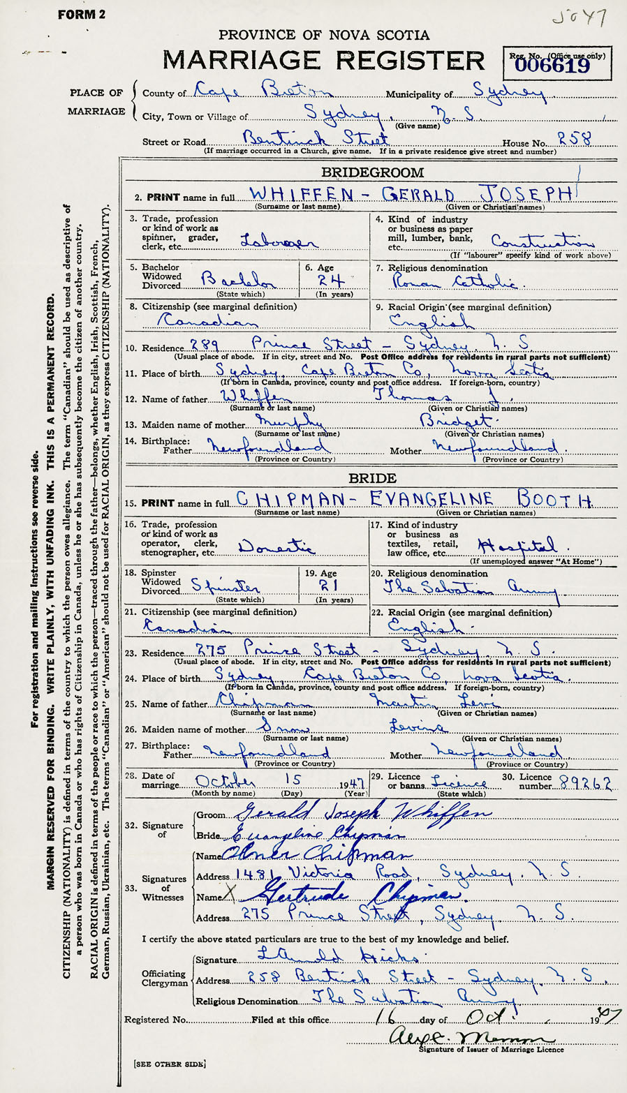 28. Date of marriage October 15 1947 29. By license or banns License 30. License number 89262