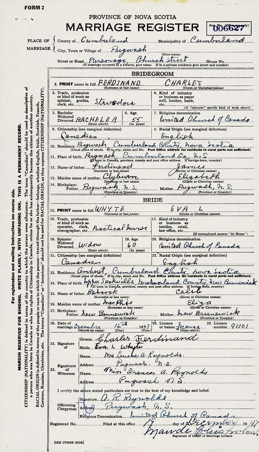 28. Date of marriage December 16 1947 29. By license or banns License 30. License number 91101