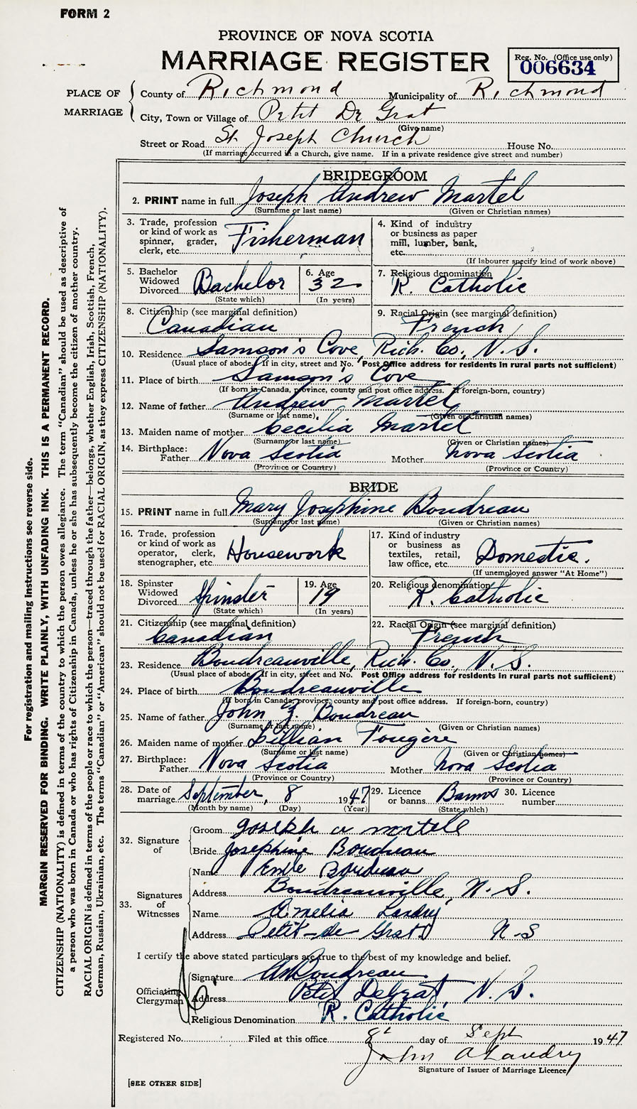 Bride Mary Josephine Boudreau