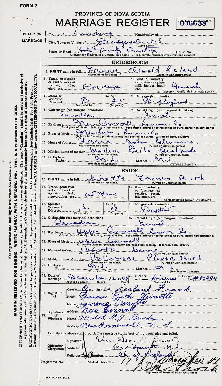 28. Date of marriage December 12 1947 29. By license or banns License 30. License number 90294