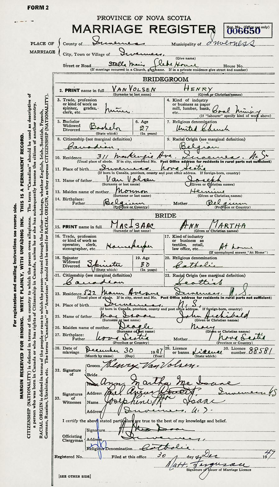 28. Date of marriage December 30 1947 29. By license or banns License 30. License number 88581