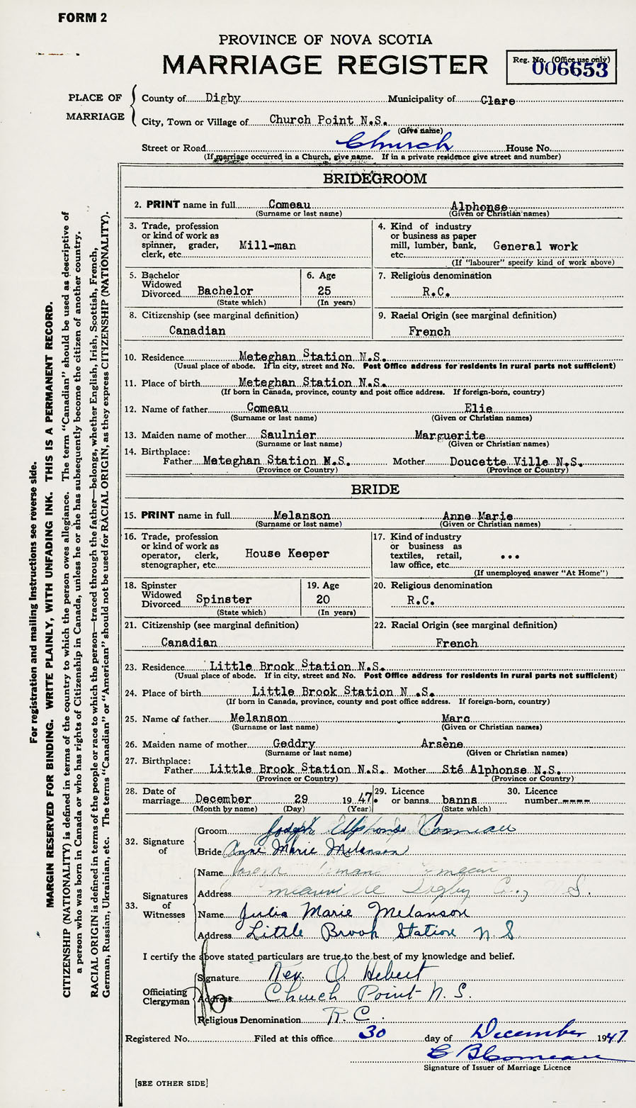 28. Date of marriage December 29 1947 29. By license or banns License 30. License number