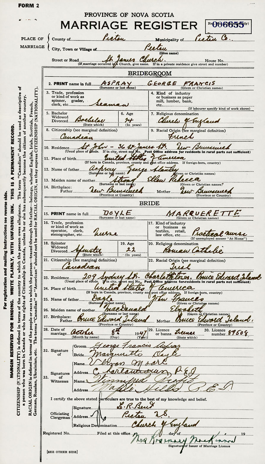 28. Date of marriage October 8 1947 29. By license or banns License 30. License number 89508