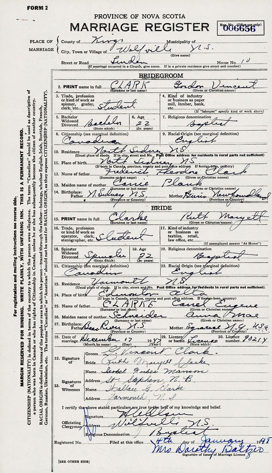 28. Date of marriage December 17 1947 29. By license or banns License 30. License number 90214