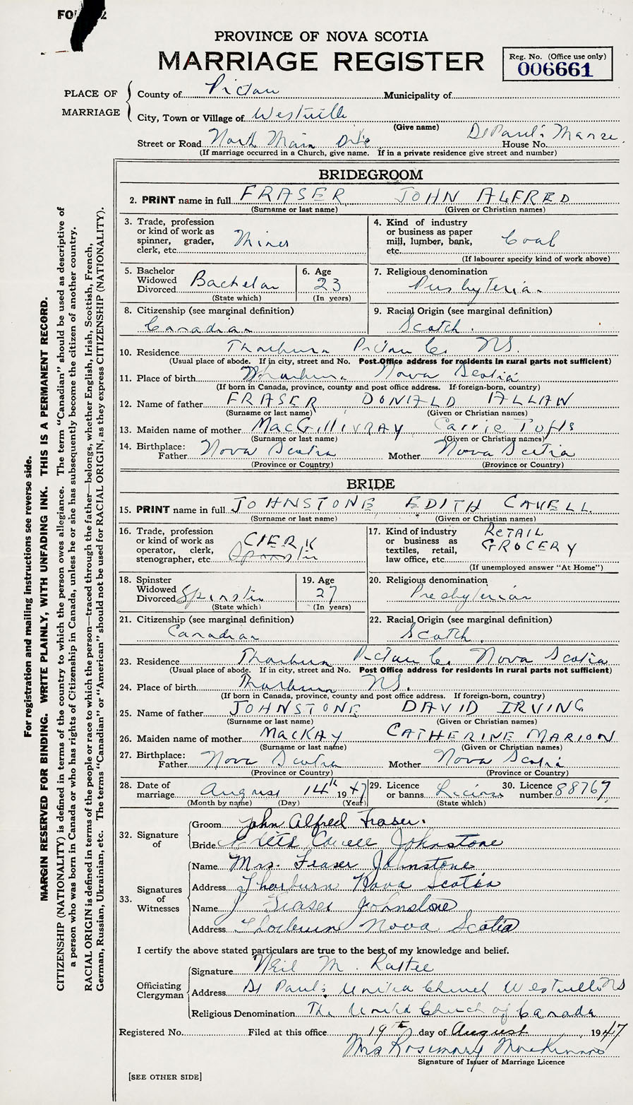 28. Date of marriage August 14 1947 29. By license or banns License 30. License number 88767
