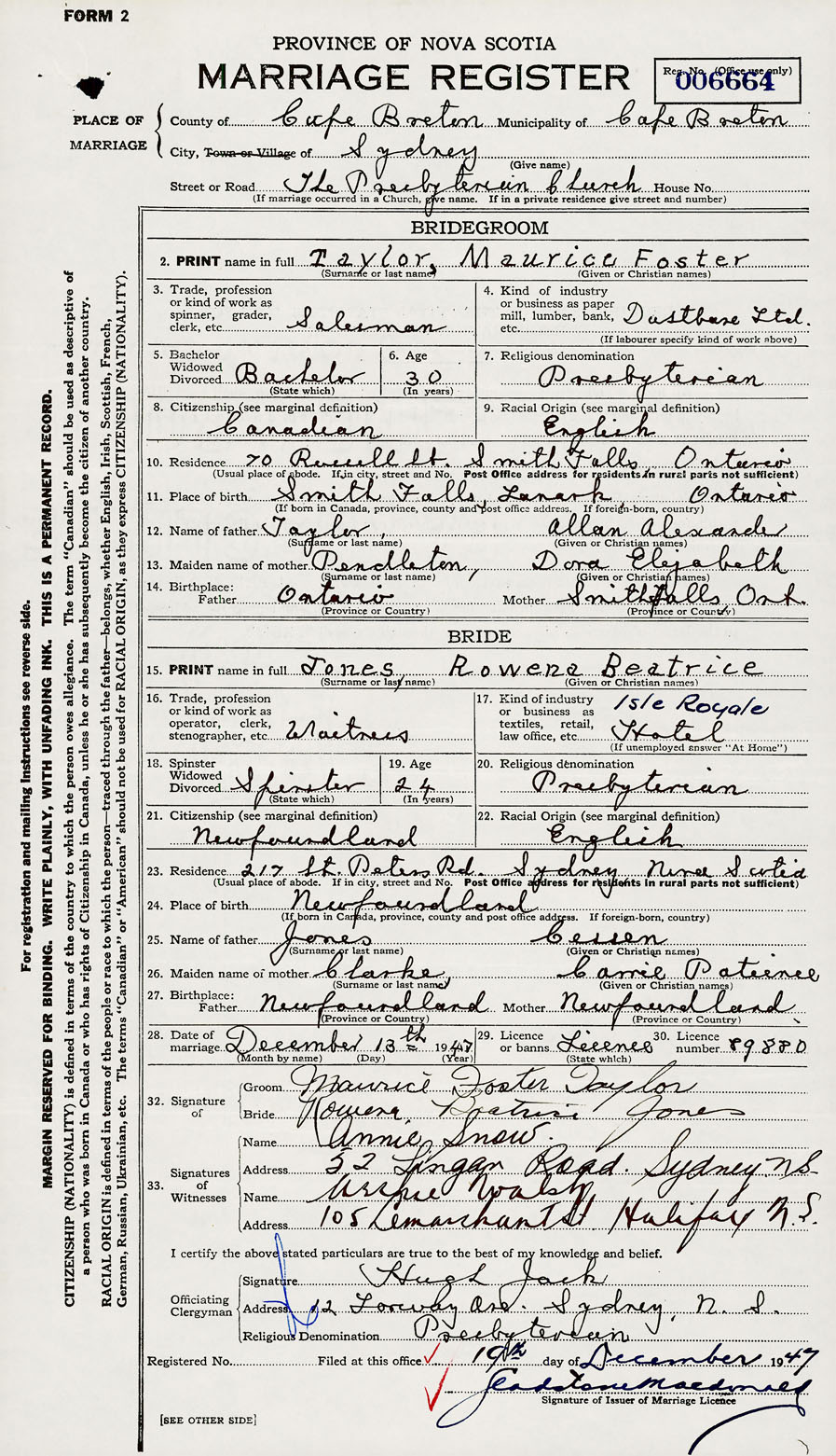 28. Date of marriage December 13 1947 29. By license or banns License 30. License number 89880