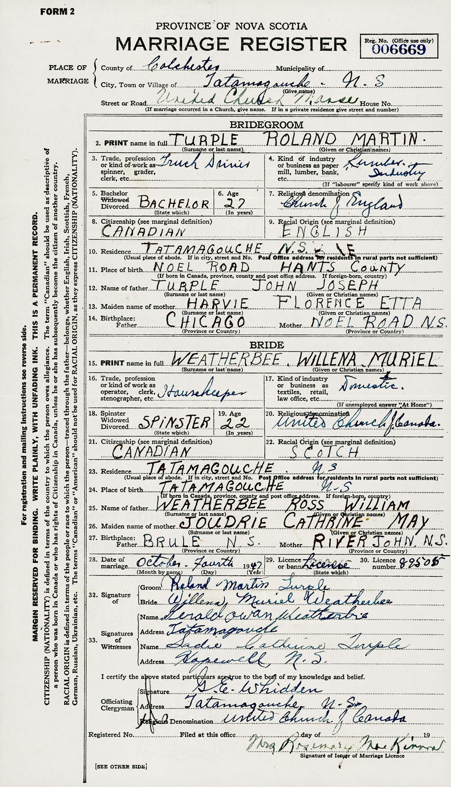 28. Date of marriage October 4 1947 29. By license or banns License 30. License number 89505