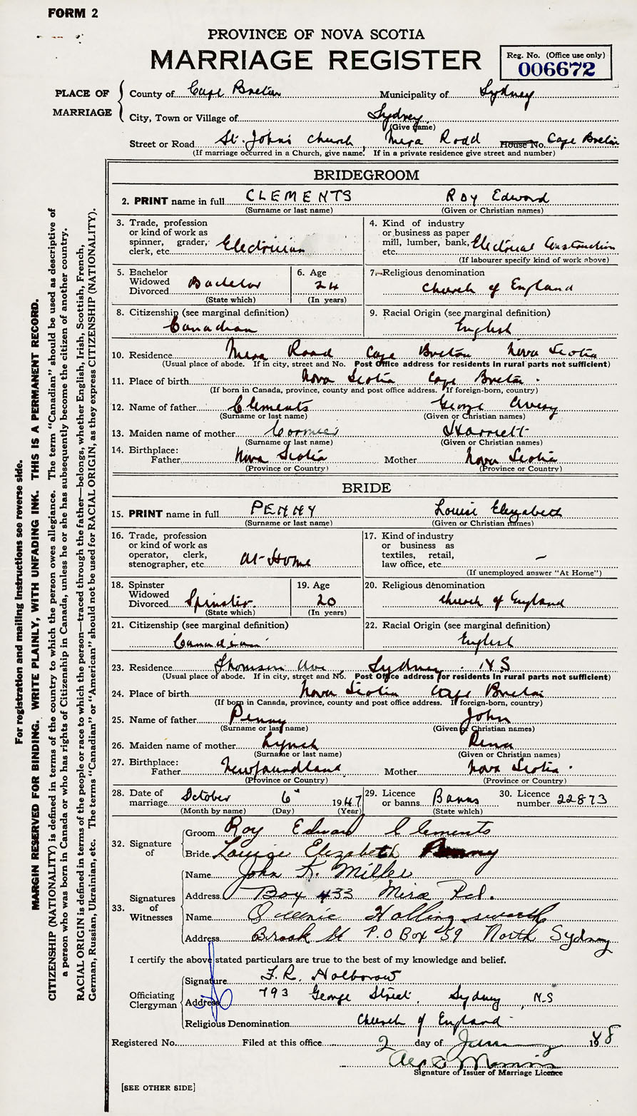 28. Date of marriage October 6 1947 29. By license or banns License 30. License number