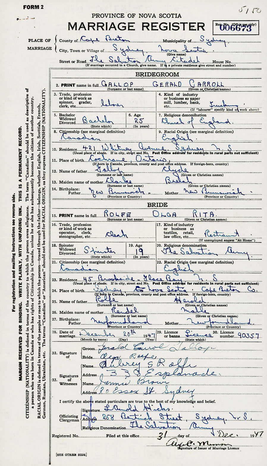 28. Date of marriage December 20 1947 29. By license or banns License 30. License number 90357