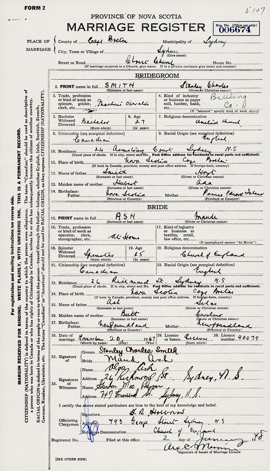 28. Date of marriage November 20 1947 29. By license or banns License 30. License number 90079