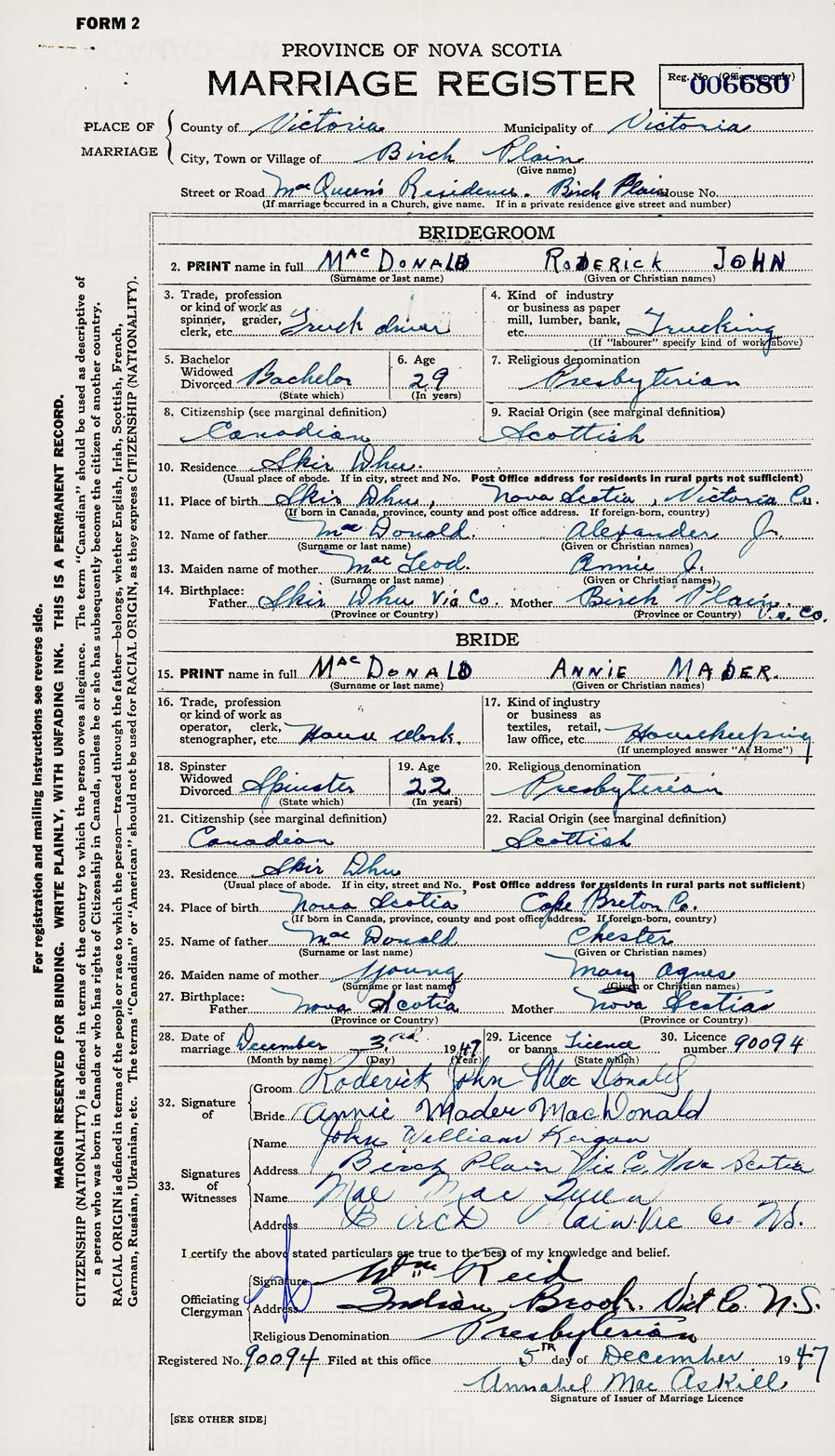 28. Date of marriage December 3 1947 29. By license or banns License 30. License number 90094