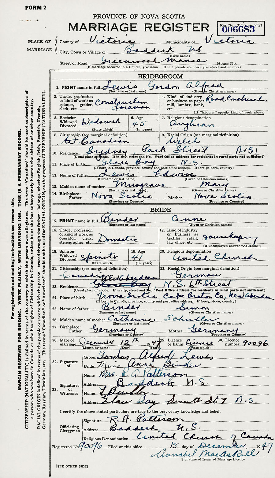 28. Date of marriage December 12 1947 29. By license or banns License 30. License number 90096