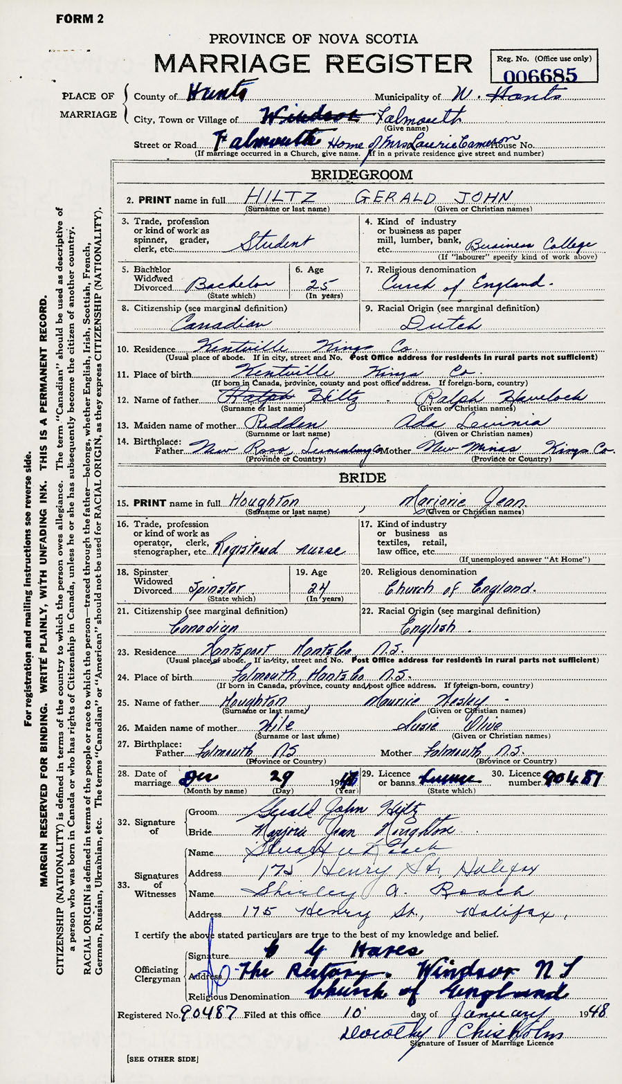 28. Date of marriage December 29 1947 29. By license or banns License 30. License number 90487