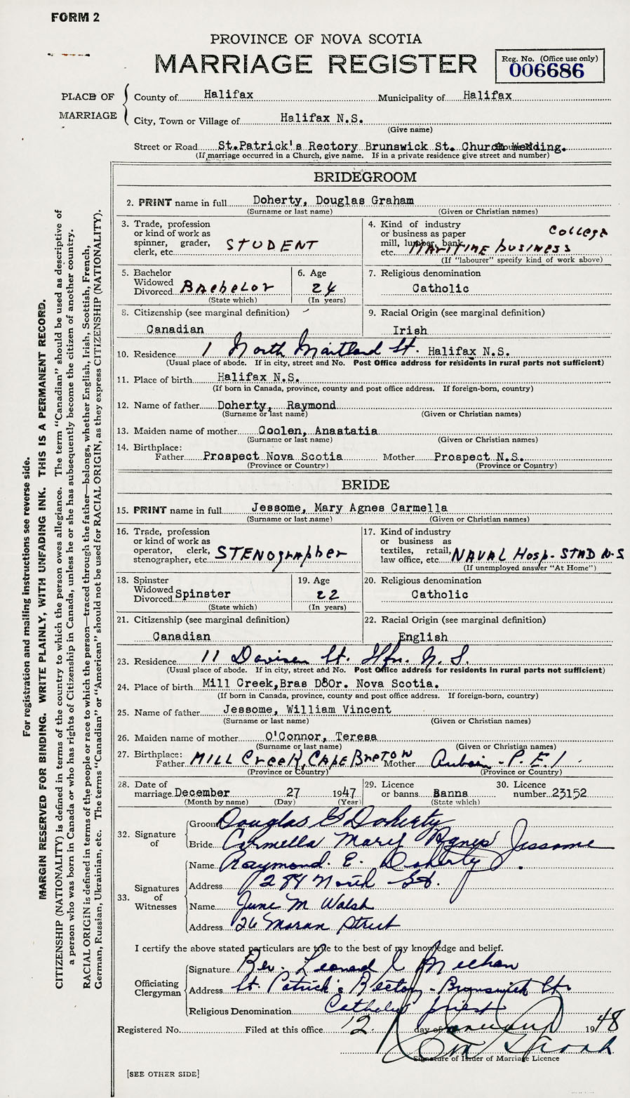 28. Date of marriage December 27 1947 29. By license or banns License 30. License number 23152