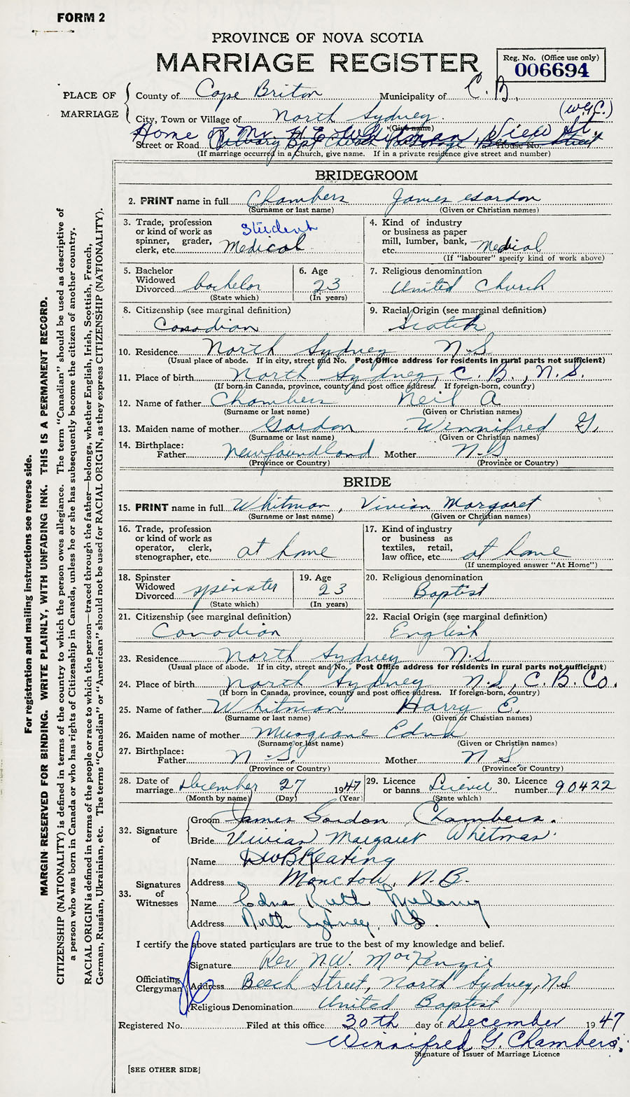 28. Date of marriage December 27 1947 29. By license or banns License 30. License number 90422