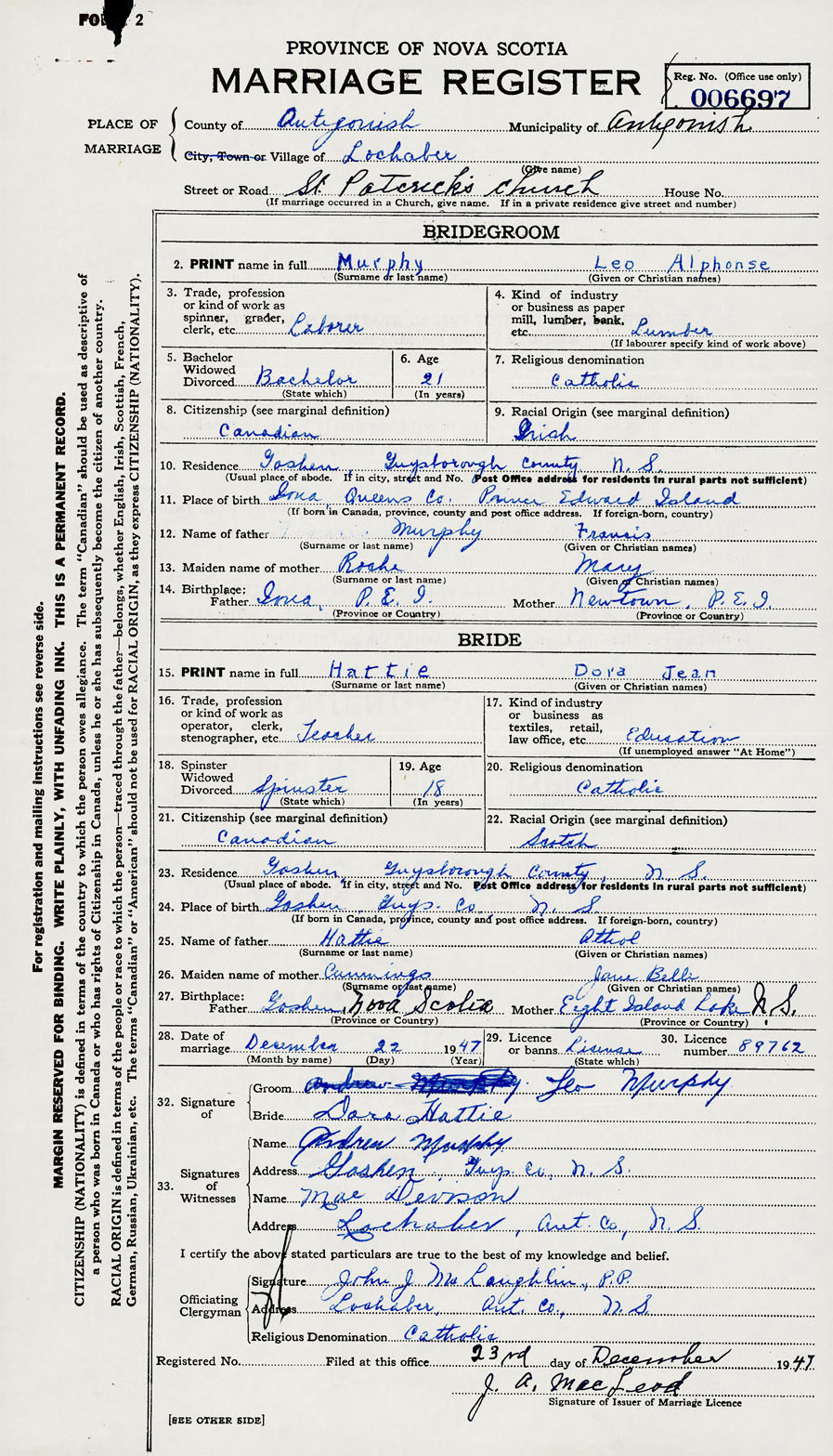 28. Date of marriage December 22 1947 29. By license or banns License 30. License number 89762