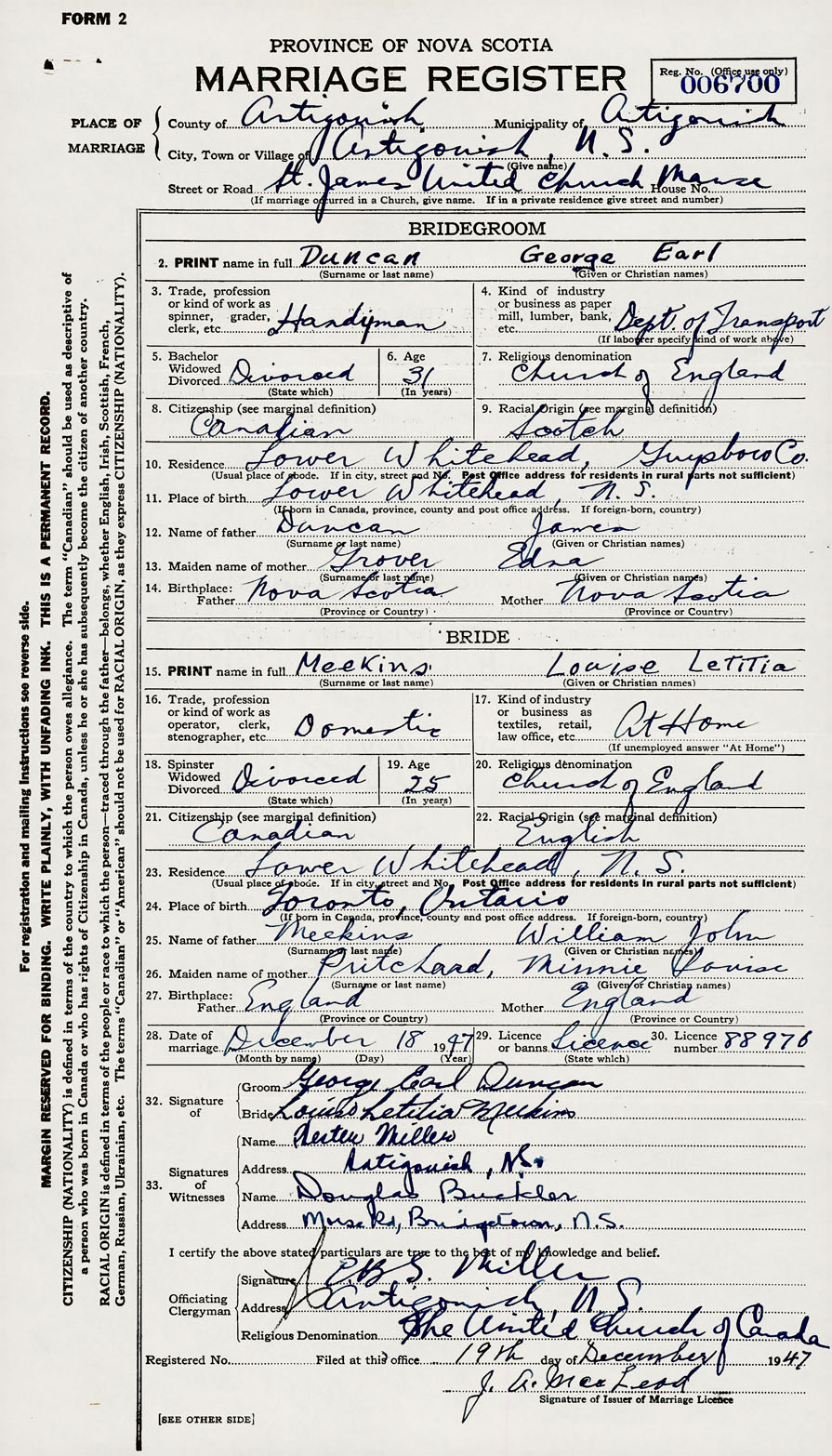 28. Date of marriage December 18 1947 29. By license or banns License 30. License number 88976