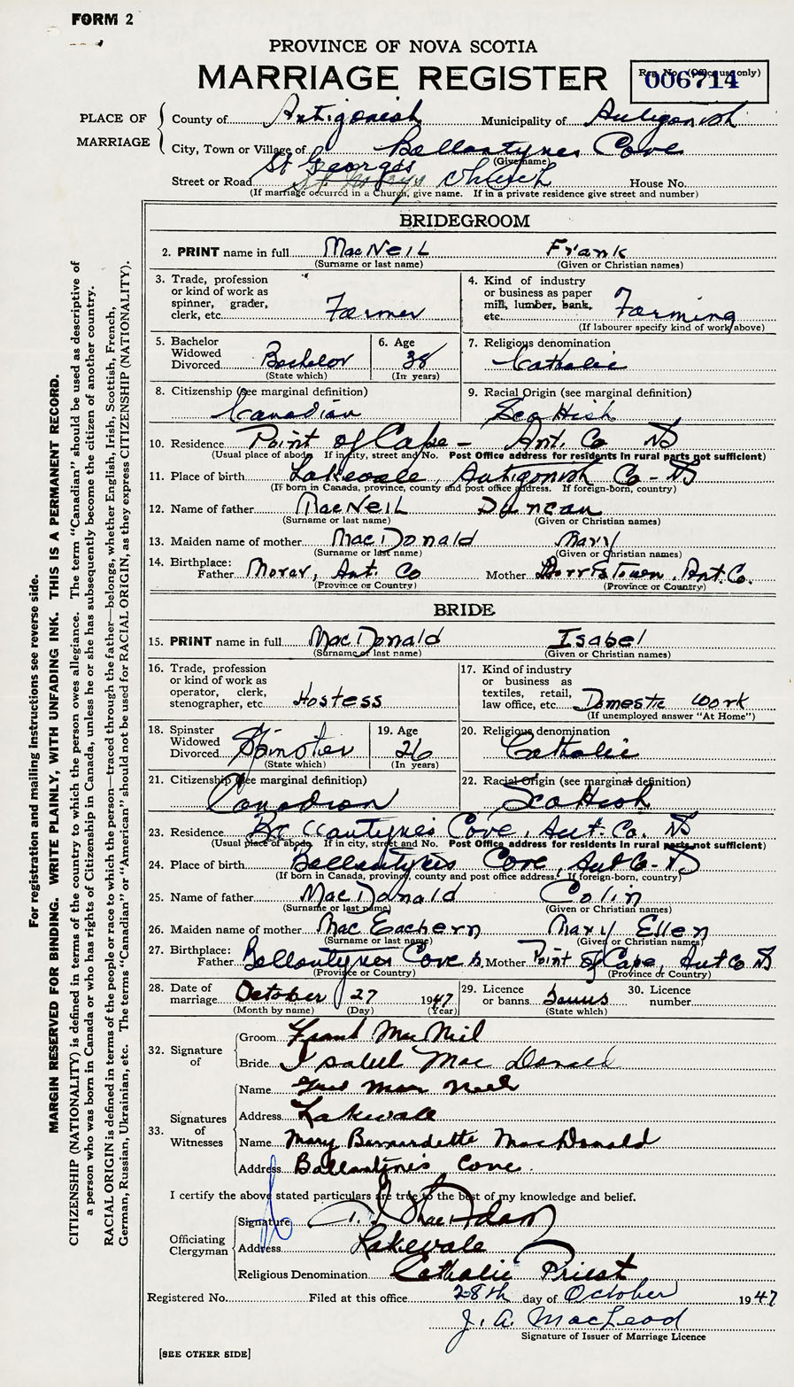 28. Date of marriage October 27 1947 29. By license or banns License 30. License number