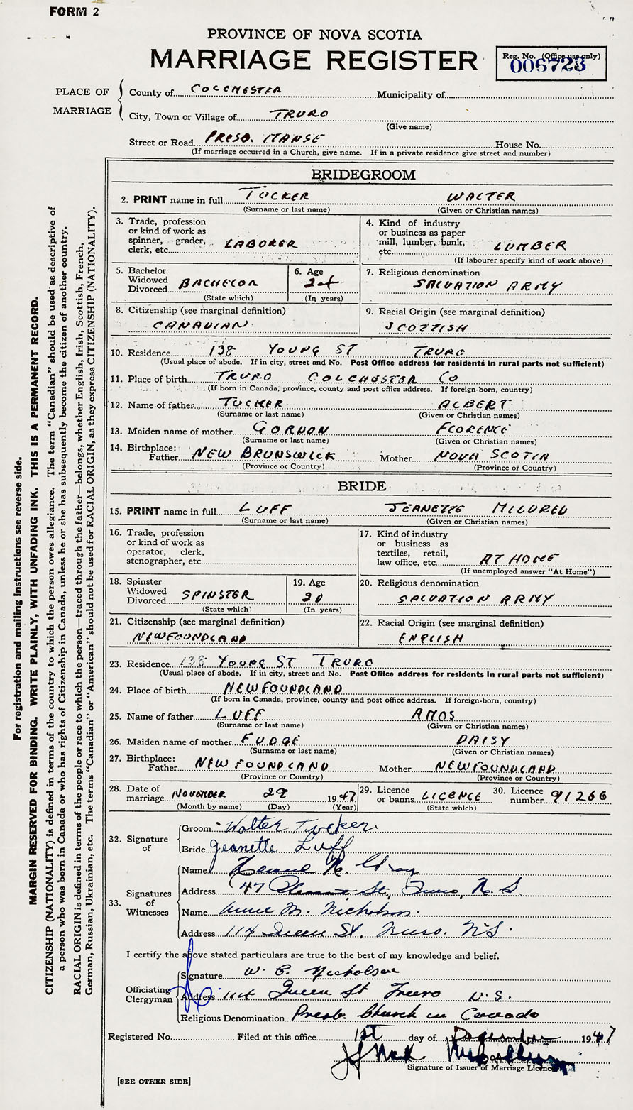 28. Date of marriage November 29 1947 29. By license or banns License 30. License number 91266