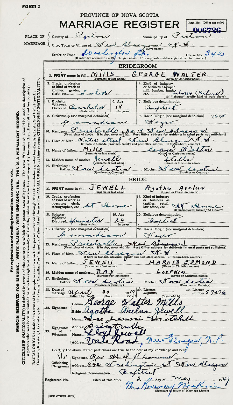 28. Date of marriage April 30 1947 29. By license or banns License 30. License number 87076