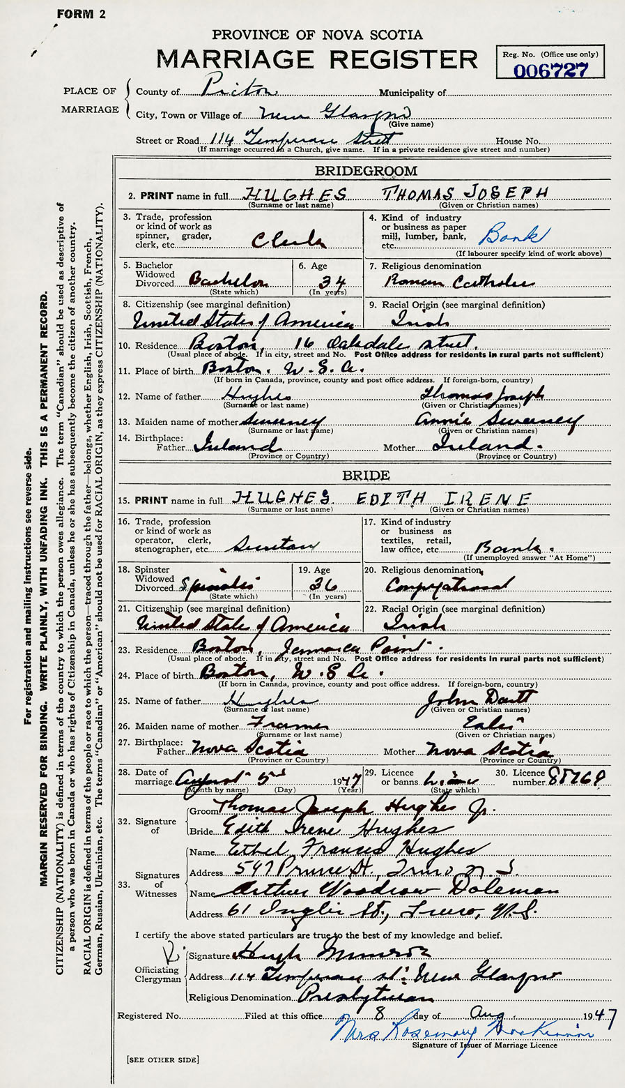 28. Date of marriage August 5 1947 29. By license or banns License 30. License number 88269