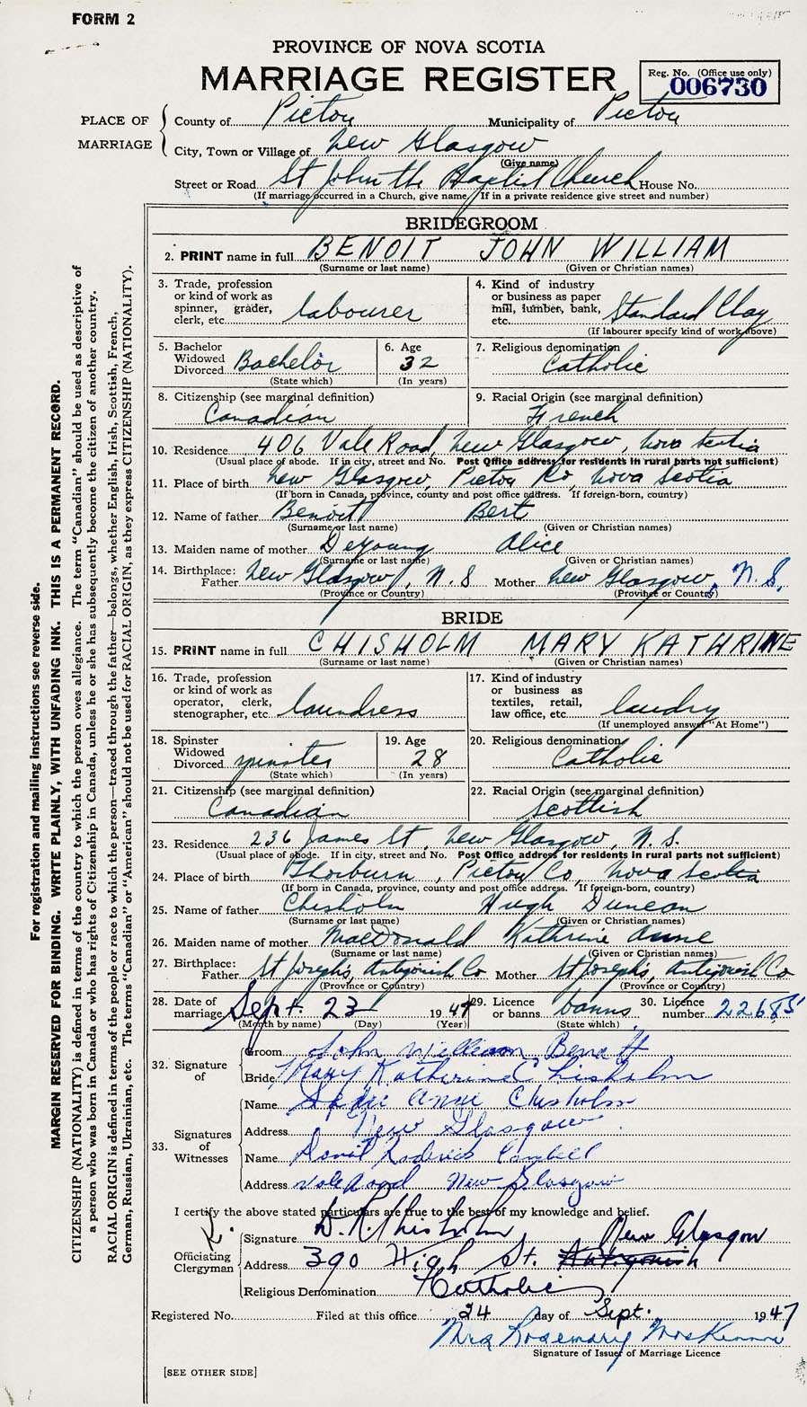 28. Date of marriage September 23 1947 29. By license or banns License 30. License number