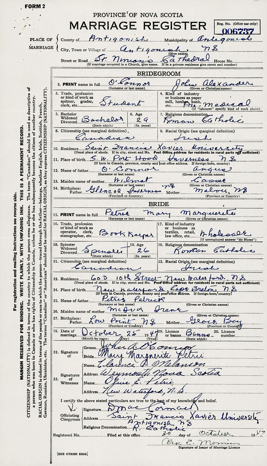 28. Date of marriage October 25 1947 29. By license or banns Banns 30. License number Banns