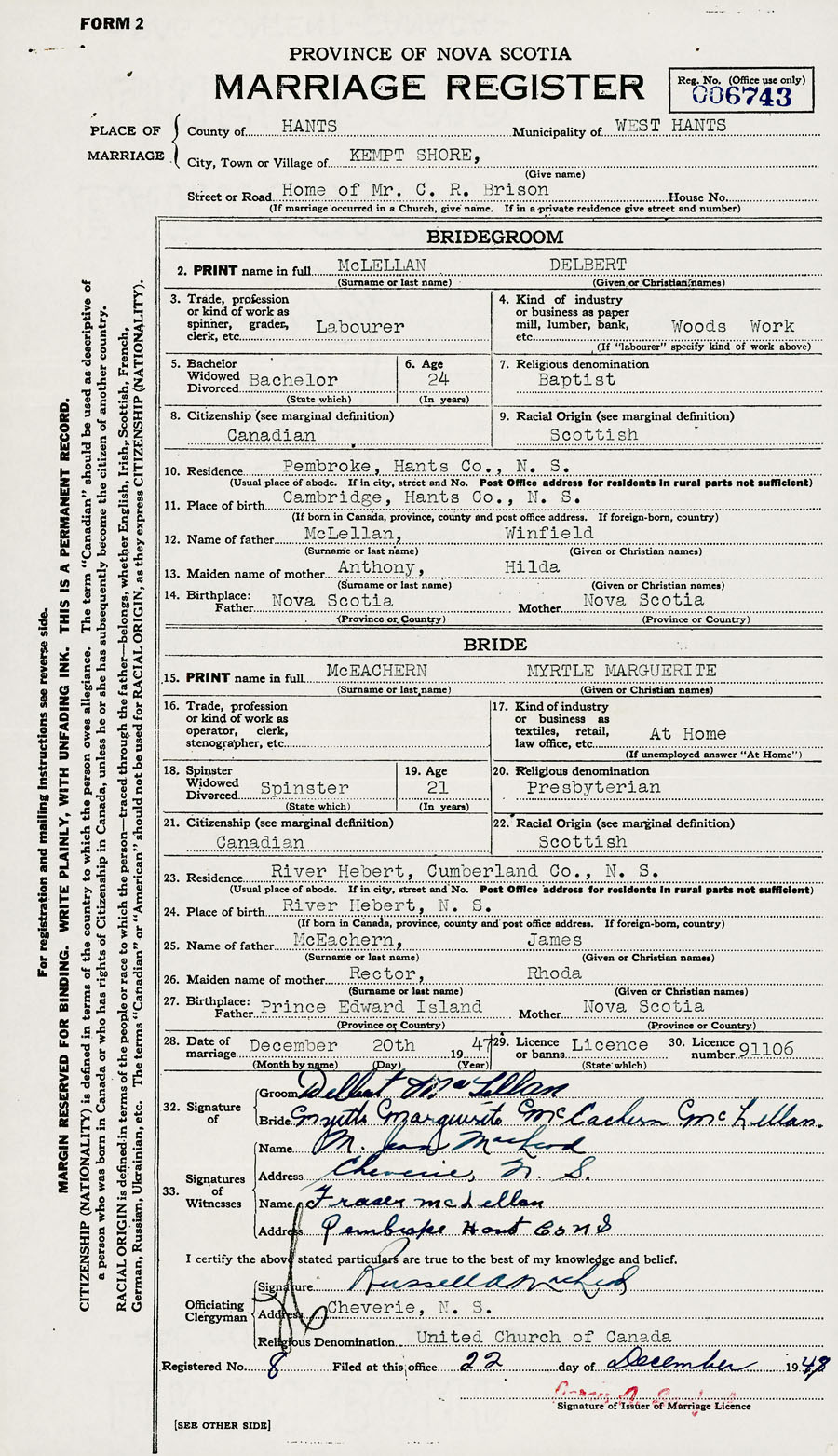 28. Date of marriage December 20 1947 29. By license or banns License 30. License number 91106