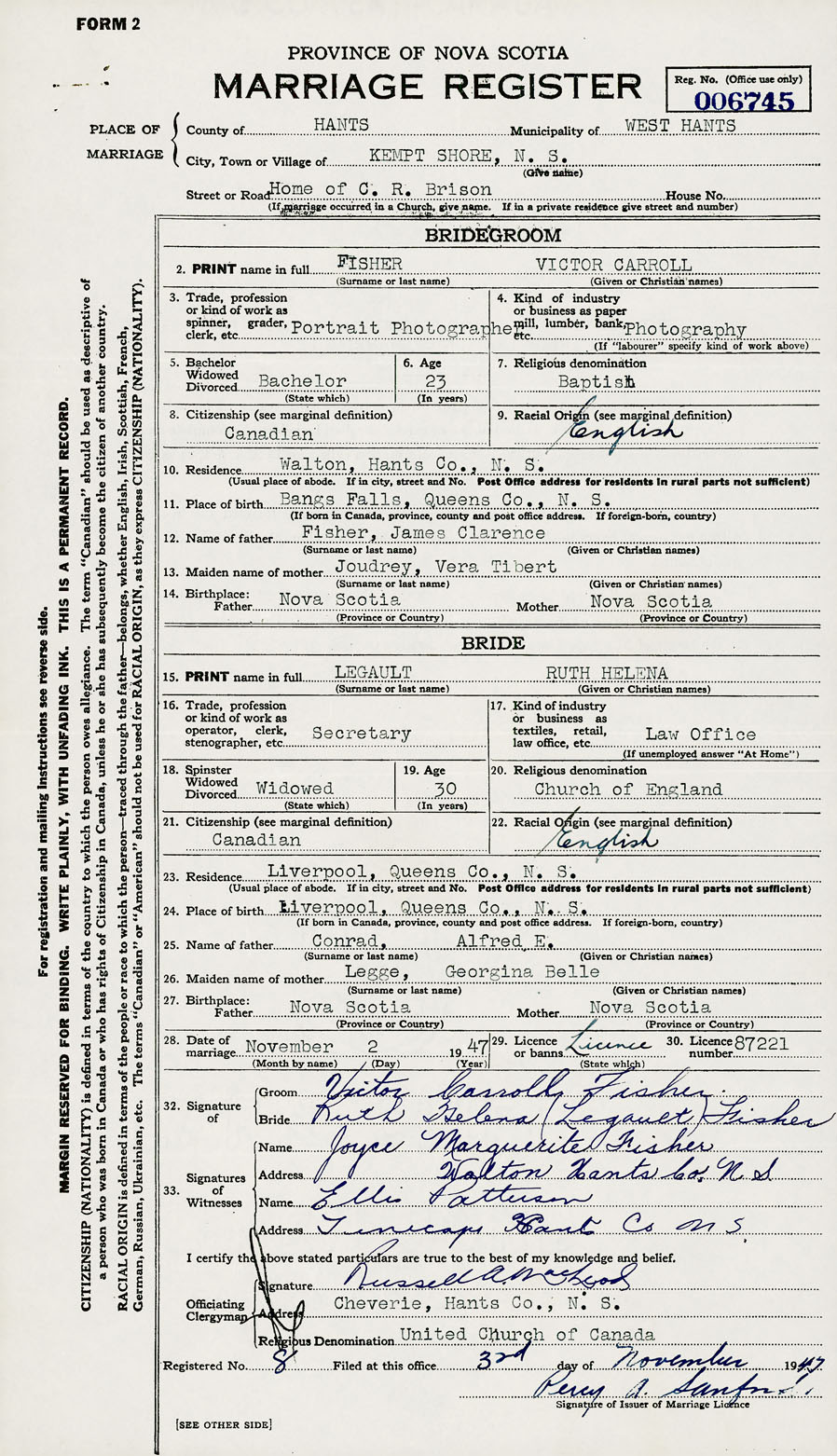 28. Date of marriage November 2 1947 29. By license or banns License 30. License number 87221