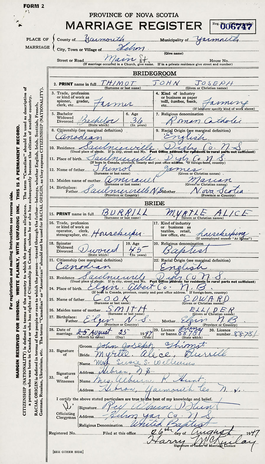 28. Date of marriage August 25 1947 29. By license or banns License 30. License number 88781