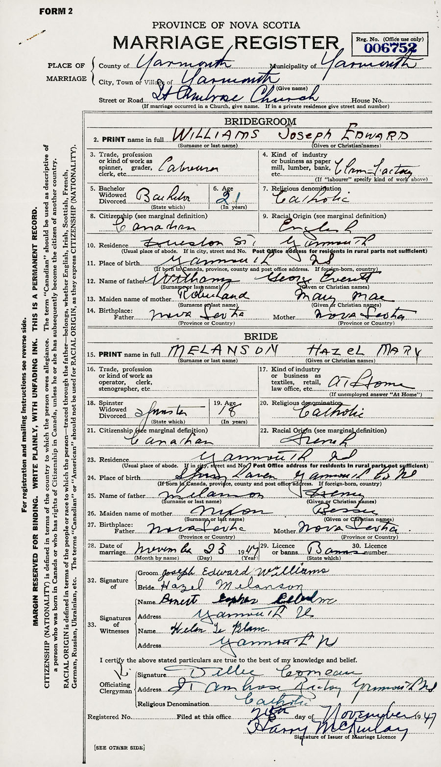 28. Date of marriage November 25 1947 29. By license or banns License 30. License number
