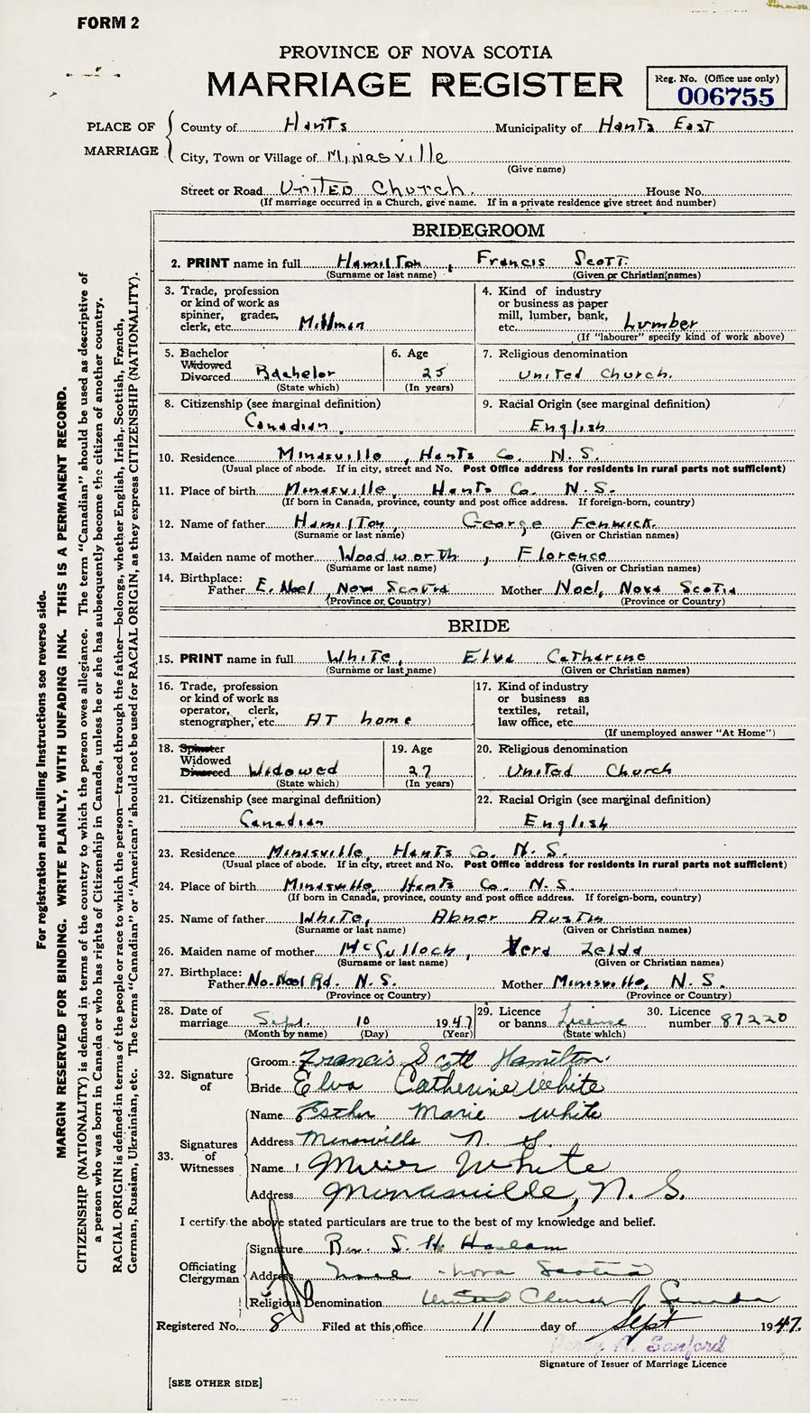 28. Date of marriage September 10 1947 29. By license or banns License 30. License number 87220