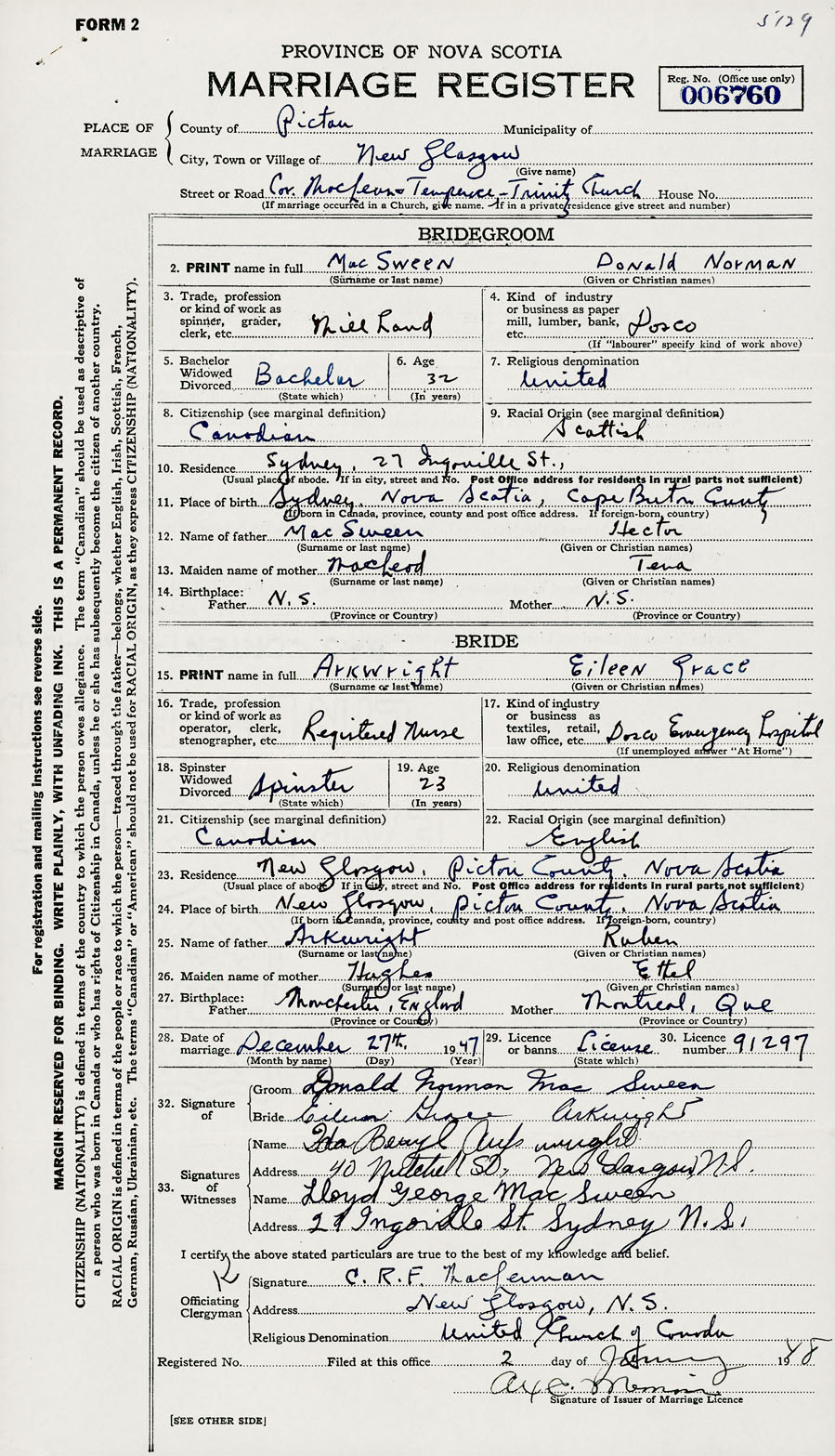28. Date of marriage December 27 1947 29. By license or banns License 30. License number 91297