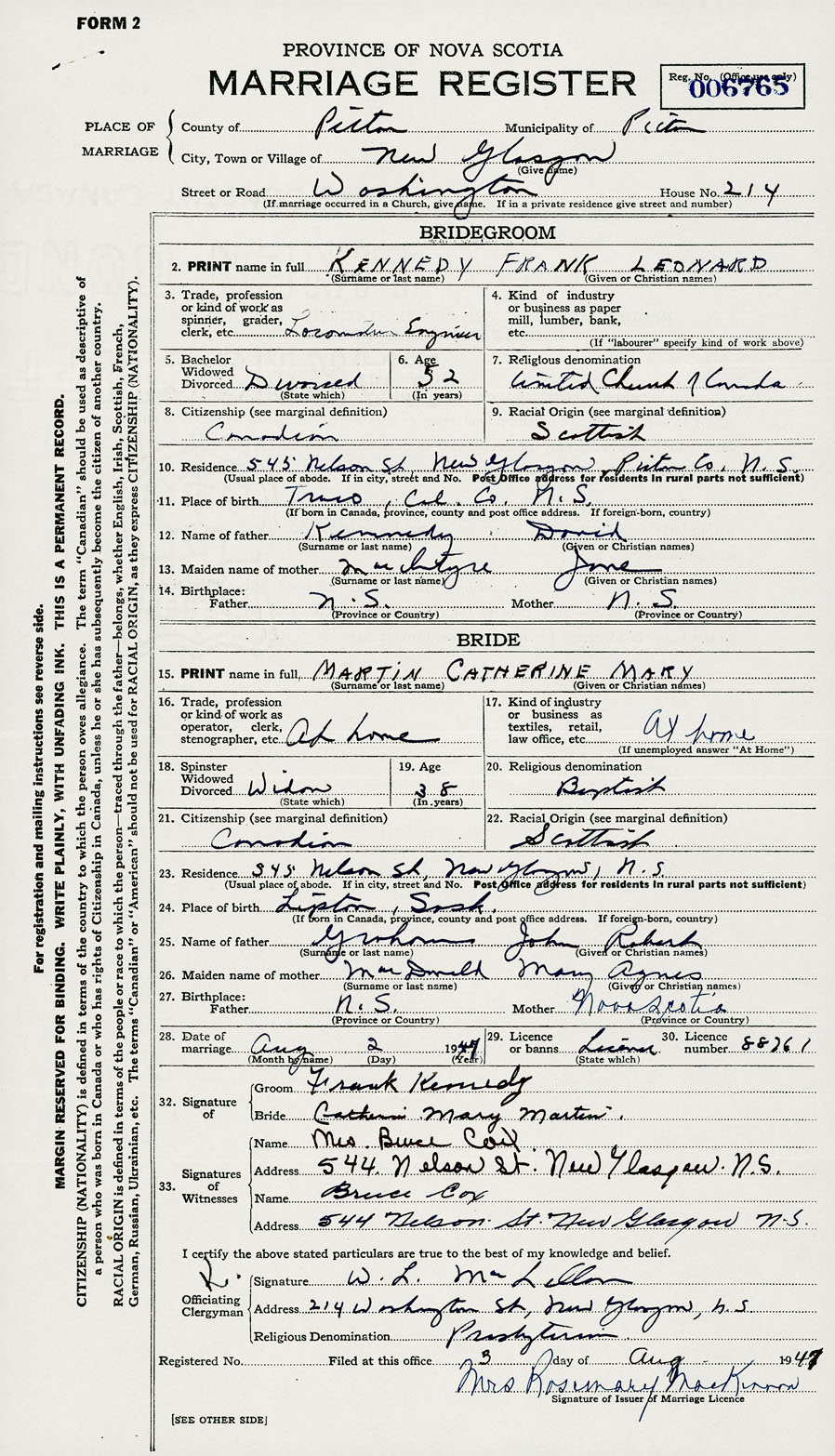 28. Date of marriage August 2 1947 29. By license or banns License 30. License number 88761