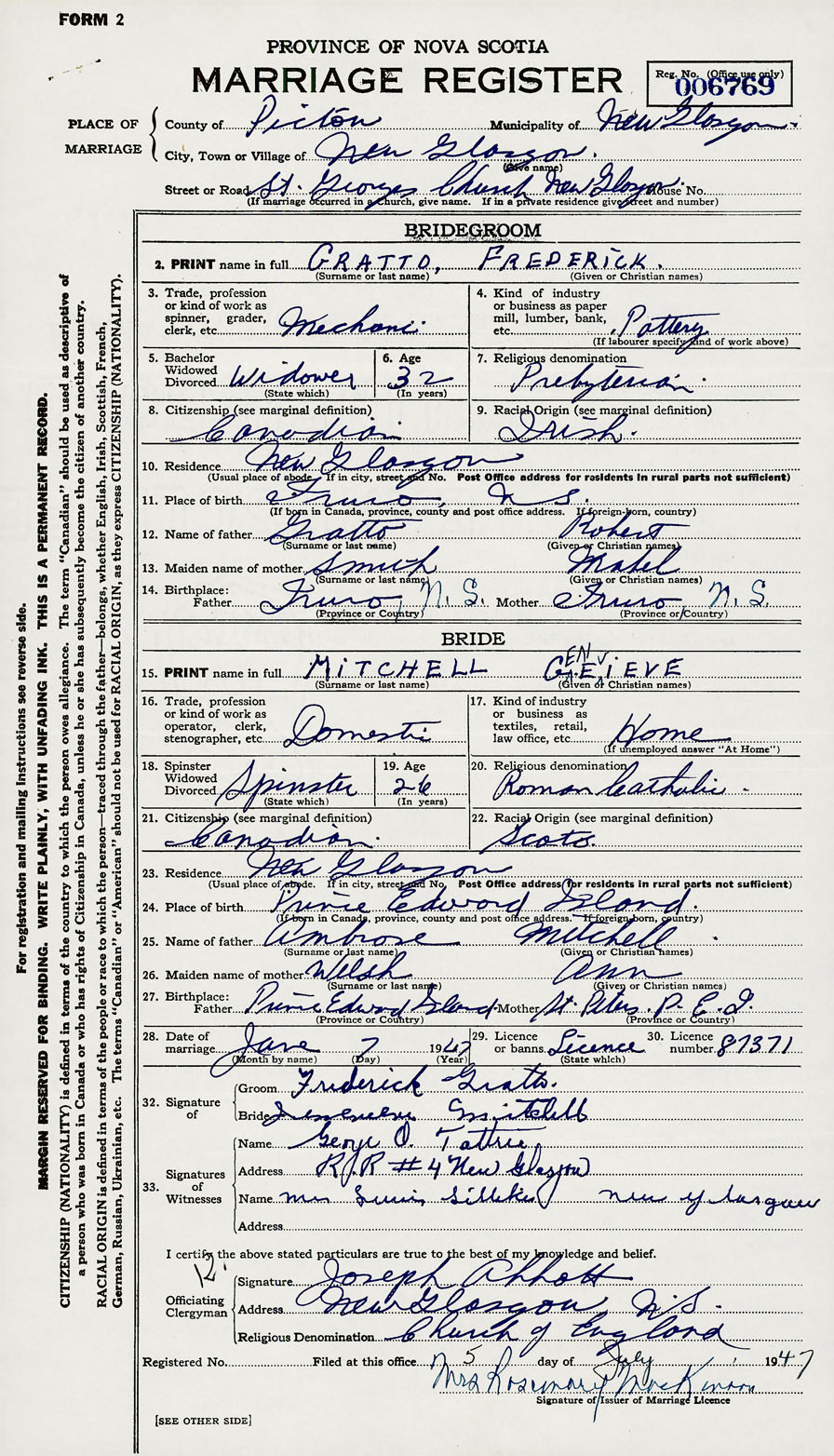 28. Date of marriage June 7 1947 29. By license or banns License 30. License number 87371