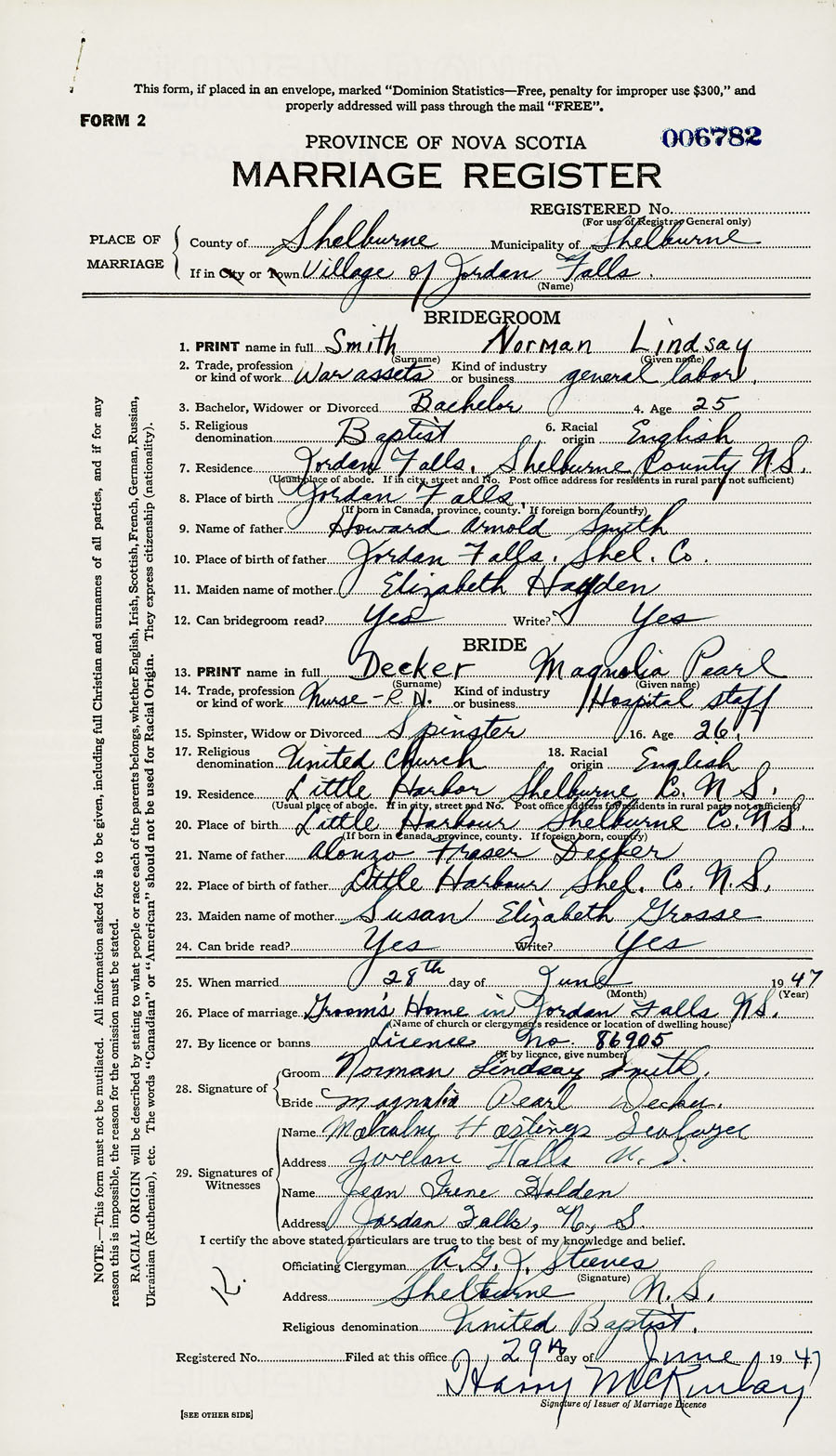 PLACE OF MARRIAGE County of Shelburne in City or Town Jordan Falls