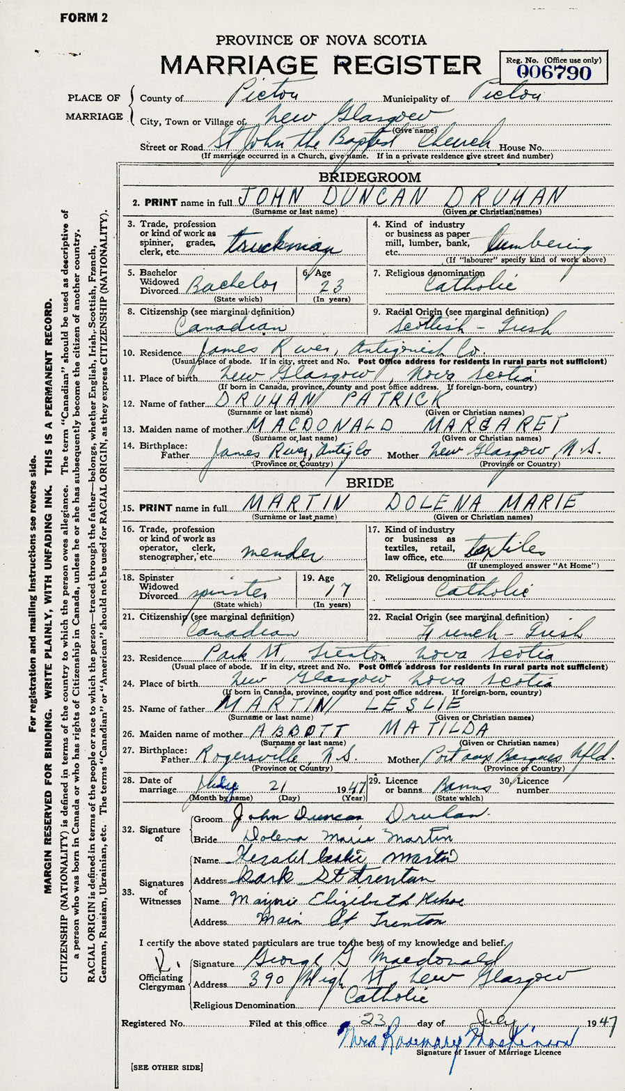 PLACE OF MARRIAGE County of Pictou